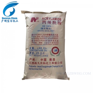 丙烯酰胺是一種不飽和酰胺,別名AM,其單體為無色透明片狀結(jié)晶,沸點(diǎn)125℃(3325Pa),熔點(diǎn)84~85℃,密度1.122g/cm3。能溶于水、乙醇、乙醚、丙酮、氯仿,不溶于苯及庚烷中,在酸堿環(huán)境中可水解成丙烯酸。是有機(jī)合成材料的單體,生產(chǎn)醫(yī)藥、染料、涂料的中間體。丙烯酰胺單體在室溫下很穩(wěn)定,但當(dāng)處于熔點(diǎn)或以上溫度、氧化條件以及在紫外線的作用下很容易發(fā)生聚合反應(yīng)。當(dāng)加熱使其溶解時(shí),丙烯酰胺釋放出強(qiáng)烈的腐蝕性氣體和氮的氧化物類化合物。