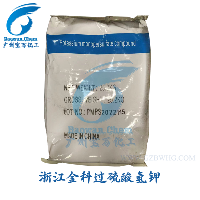 中文名 過硫酸氫鉀 外文名 Potassium peroxymonosulfate 活性氧 ≥ 4.50% 有效組份 ≥ 42.80% 水 分 ≤ 0.10% 分子式 KHSO5 英文簡稱 PMS,O